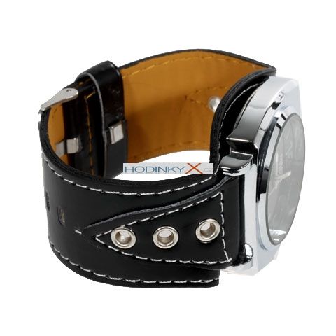 Černý ciferník se stříbrnými značkami a ručičkami pro snadné čtení.
